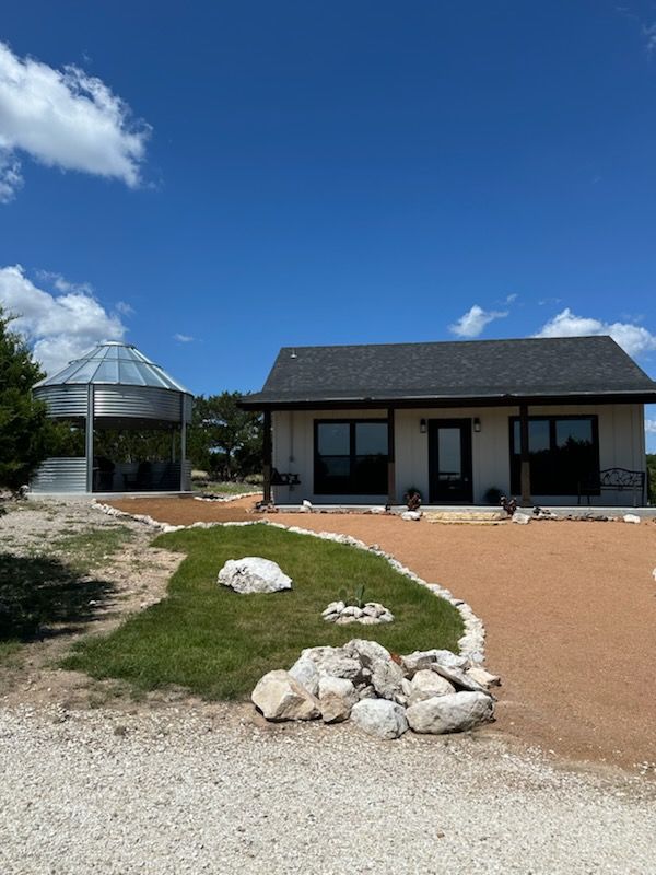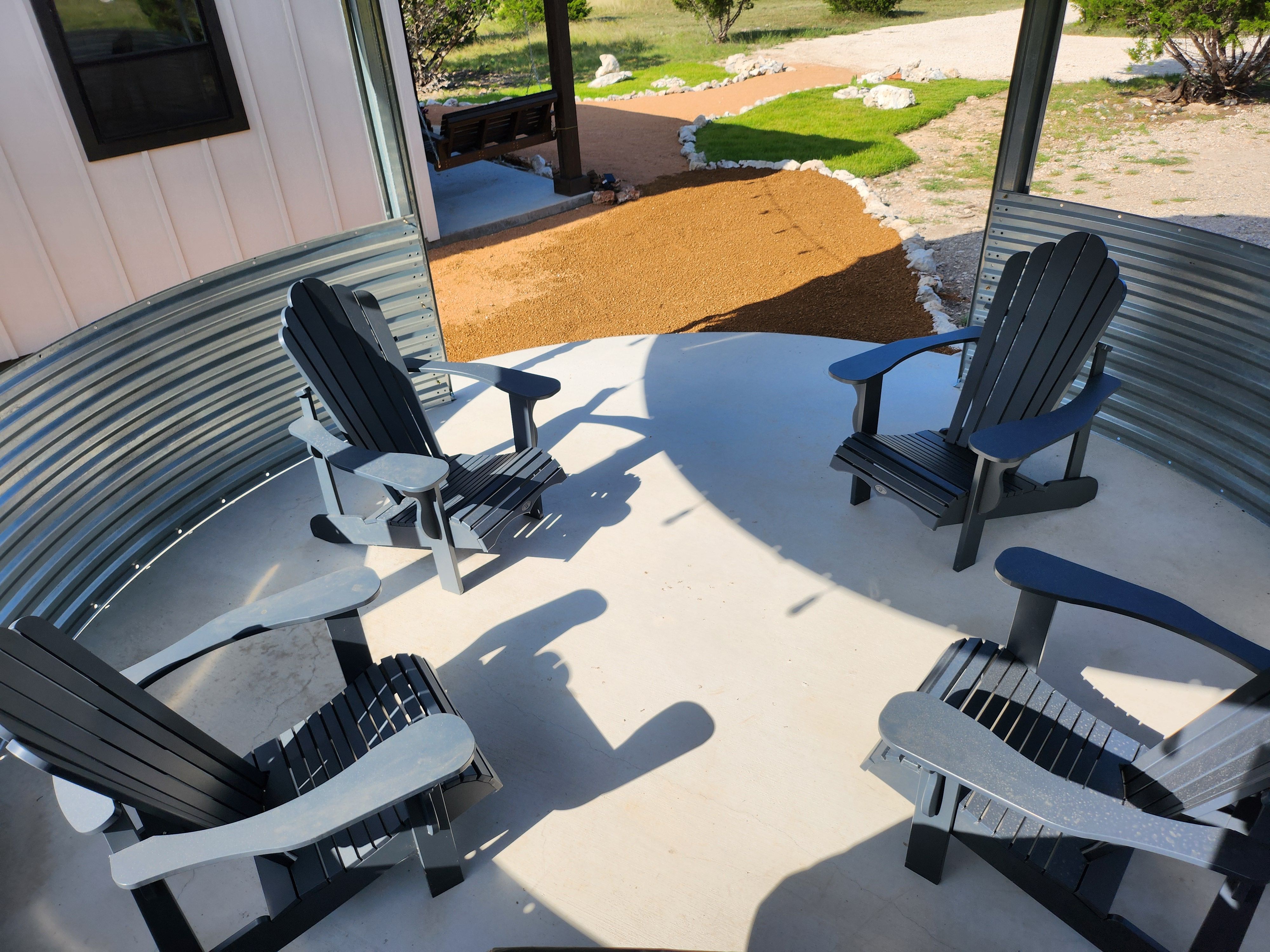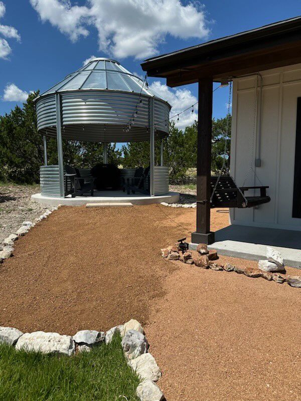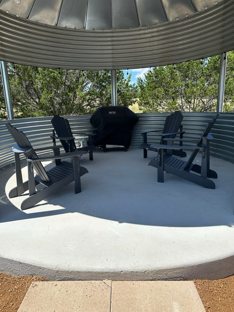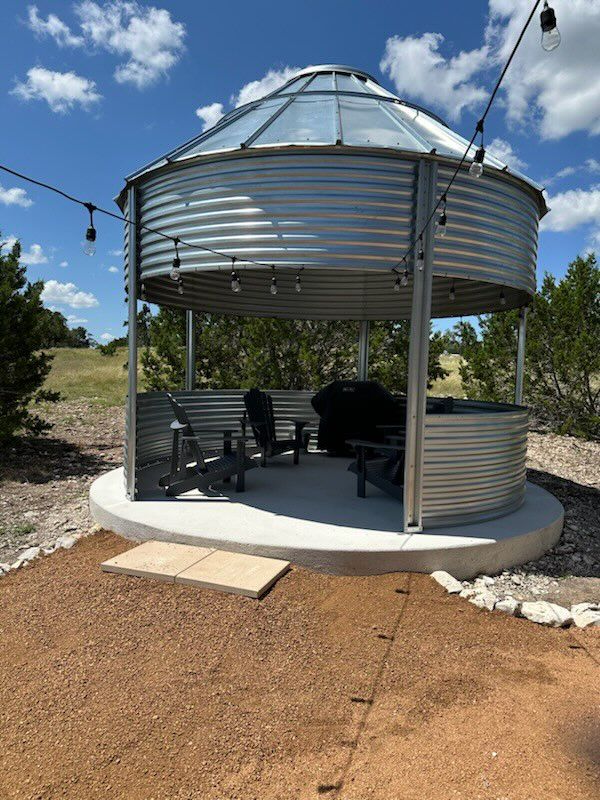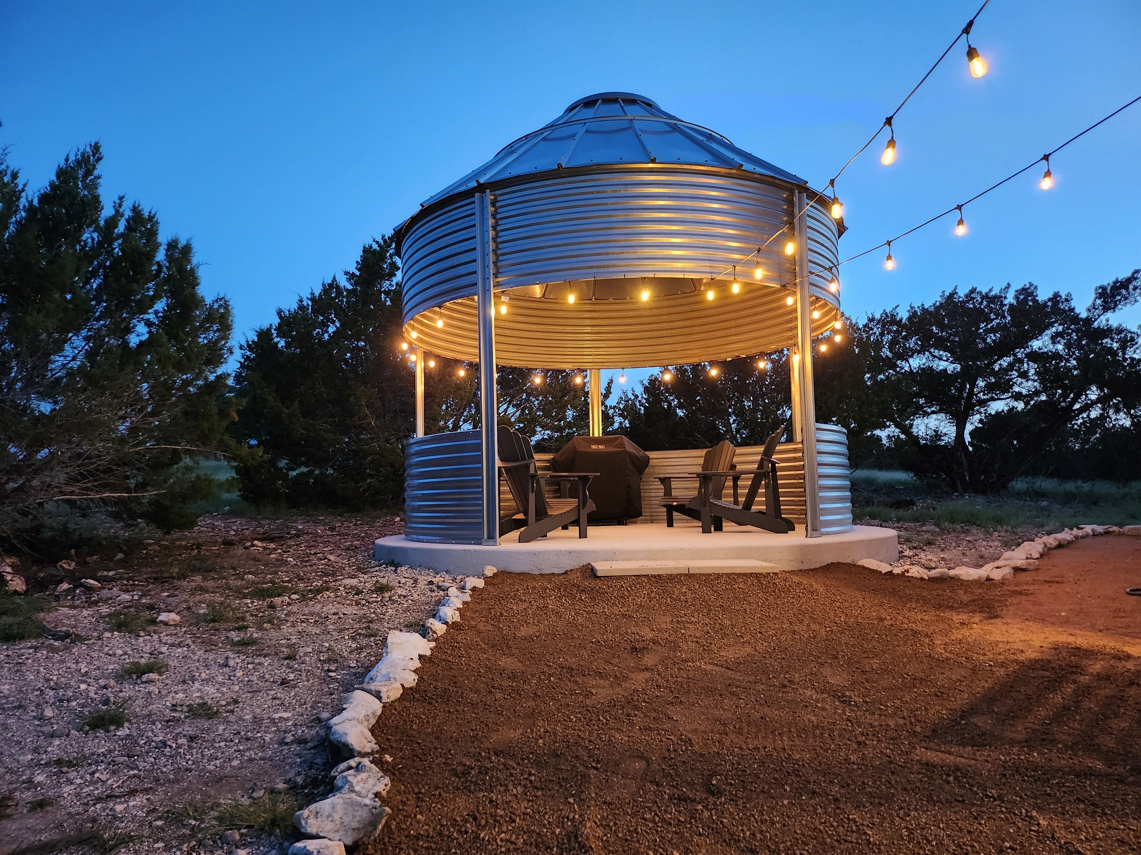 Outside our Grain Bin stile gazebo is ready for you evening entertainment, relaxation and grilling your favorite foods. The gazebo is lighted for evening enjoyment.