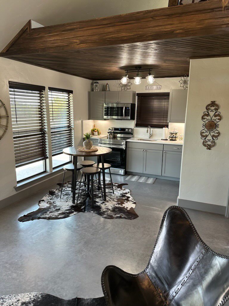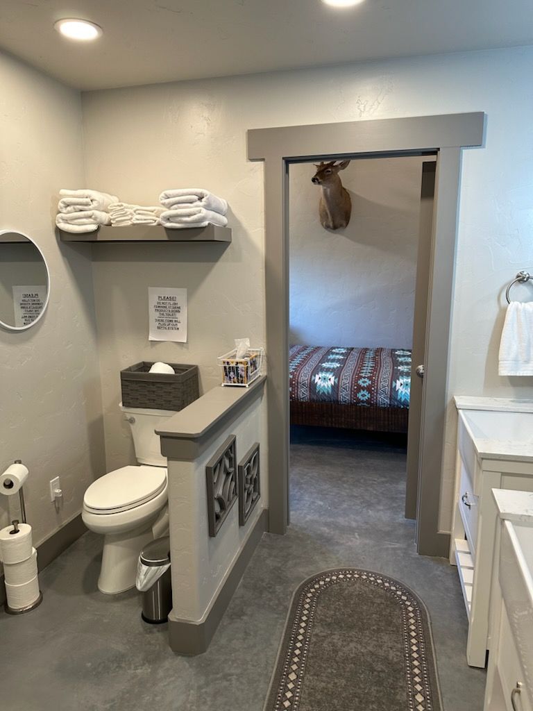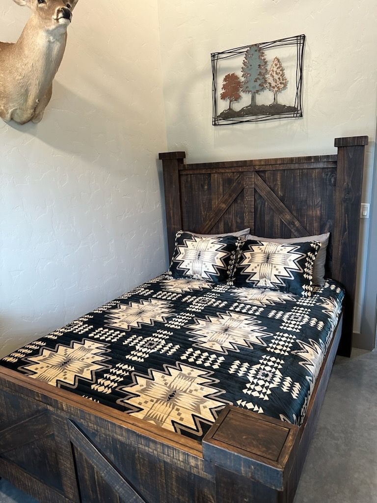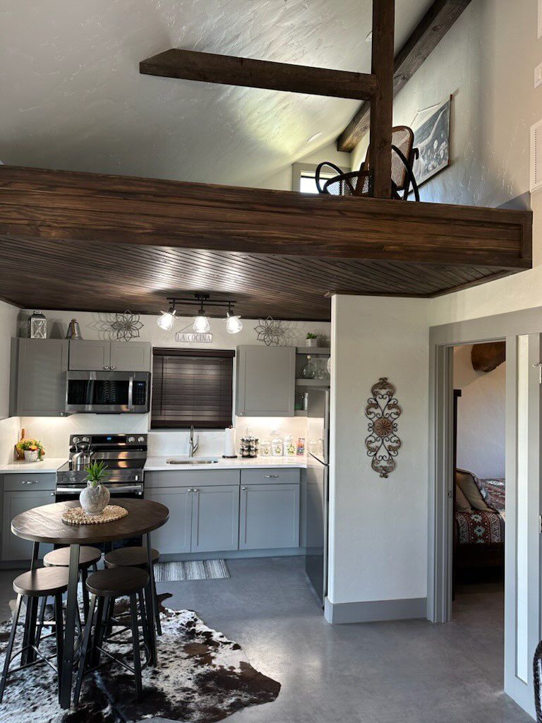 There is a full-size kitchen for preparing meals. Pots and pans, as well as dishes, silverware and glassware are provided. Paper products available too! Great time for friends to visit and enjoy their time together in this quiet countryside. We have 2 bedrooms available each with a queen bed. There is a Jack & Jill bath between the bedrooms with a shower.